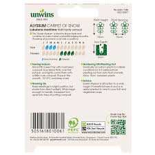 Unwins Alyssum Carpet of Snow Seeds produce masses of white flowers all summer long for good ground cover. This ‘Sweet Alyssum’ is ideal for flower beds and rockeries and also makes a beautiful edging for paths, flowering from June to September in most soils or positions.