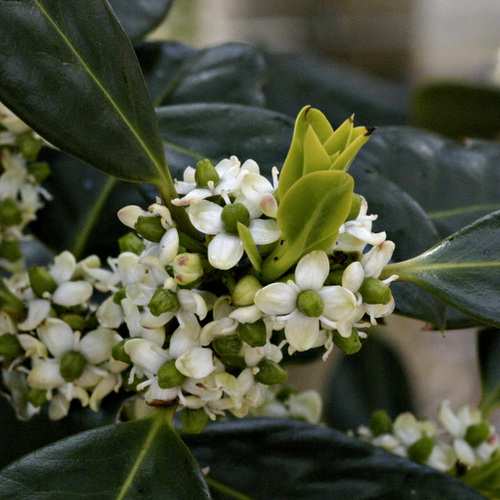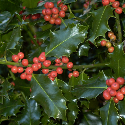 I. aquifolium is an erect, dense, oblong to pyramidal, evergreen, slow-growing when young, with elliptic to ovate, glossy, spiny, wavy-margined, dark green leaves. Small, white flowers in spring are followed by bright red berries on female, pollinated plants.