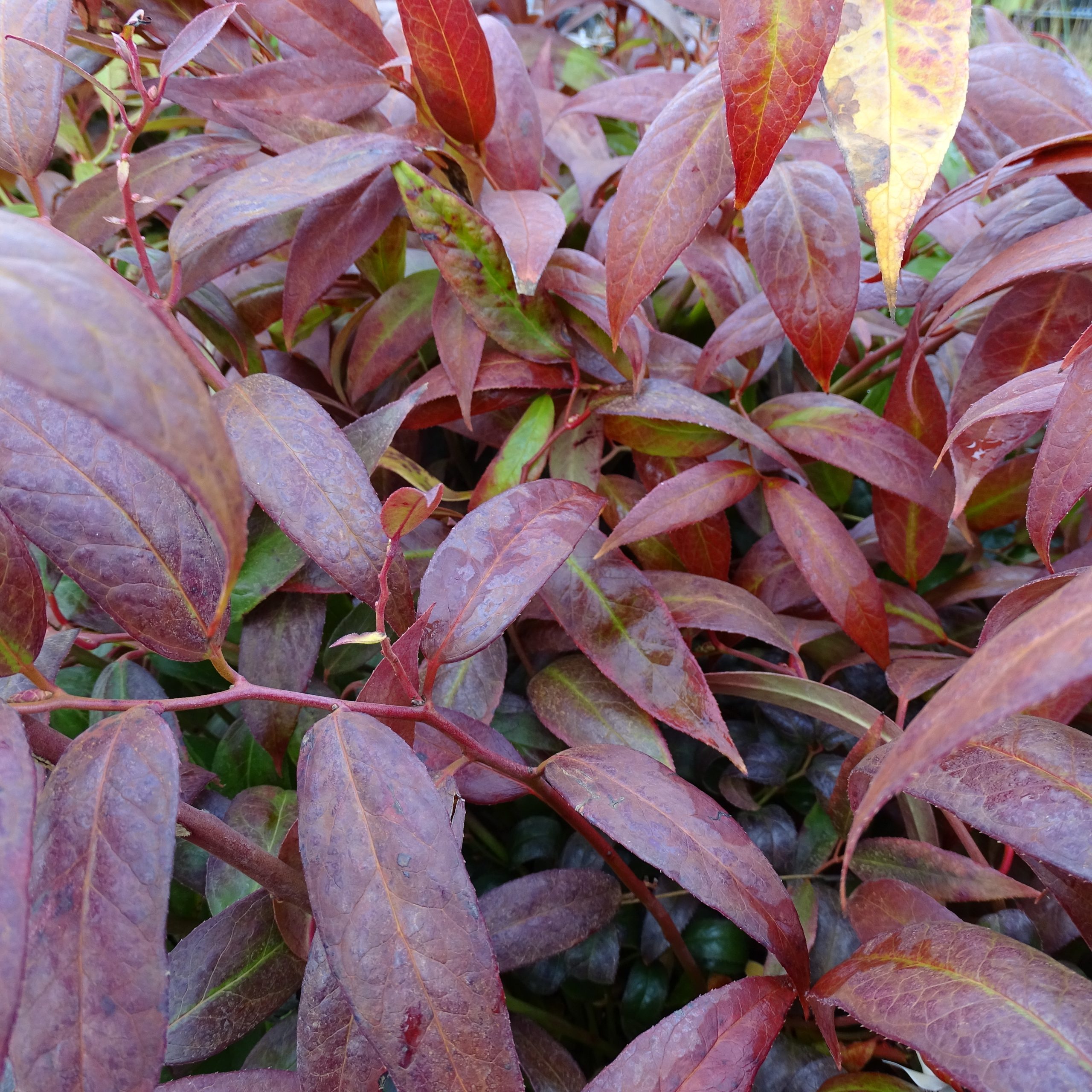 ‘Royal Ruby’ is a compact, spreading, evergreen shrub with upright to prostrate branches bearing narrowly ovate to lance-shaped, tapered, glossy, dark green leaves, red to dark reddish-purple when young, turning bronze-red in winter. Pendent racemes of urn-shaped, white flowers bloom in summer.