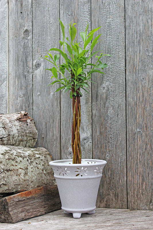 The buds which grow on the woven stem must be rubbed off regularly to maintain the twisted design. The buds which develop above the dried decorative willow band should be allowed to develop into crown growth.